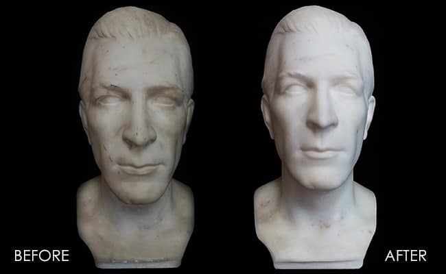 Stone Restoration Services has a shop for specialized stone restoration projects like this. The owners of this bust brought the piece to us. We used a very mild pH-neutral, stone-safe cleaner and painstakingly cleaned the bust by hand, utilizing small, non-abrasive cleaning tools, as needed. See for yourself the dramatic difference in the AFTER image. The owners were very pleased with the results.